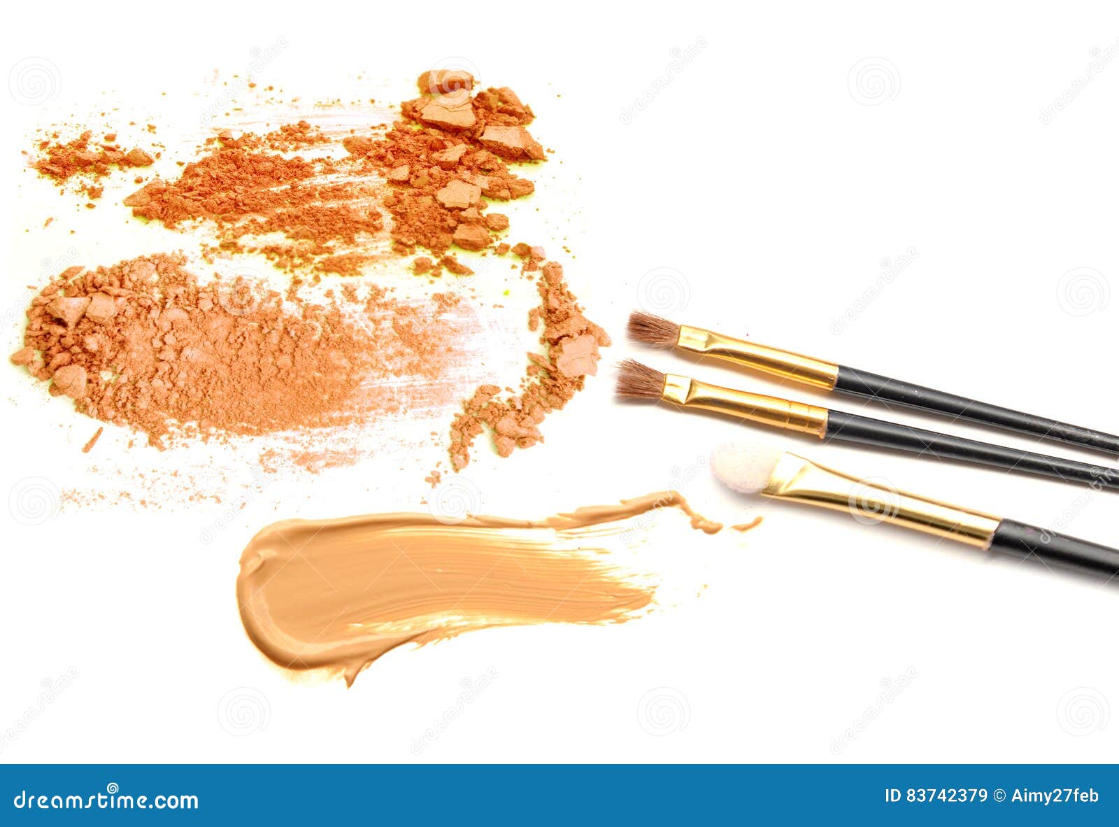 Beige And Orange Crushed Eyeshadow And Makeup Brush Isolated