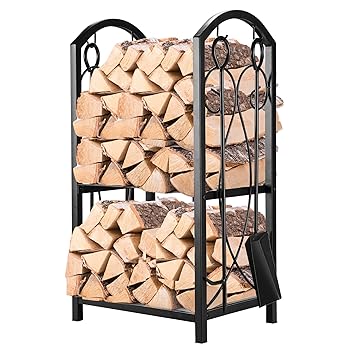Pinty Firewood Log Rack With 4 Tools Firewood Storage Fireplace Tool Set Indoor Outdoor Wrought Iron Firewood Holders Lumber Storage Stacking Black